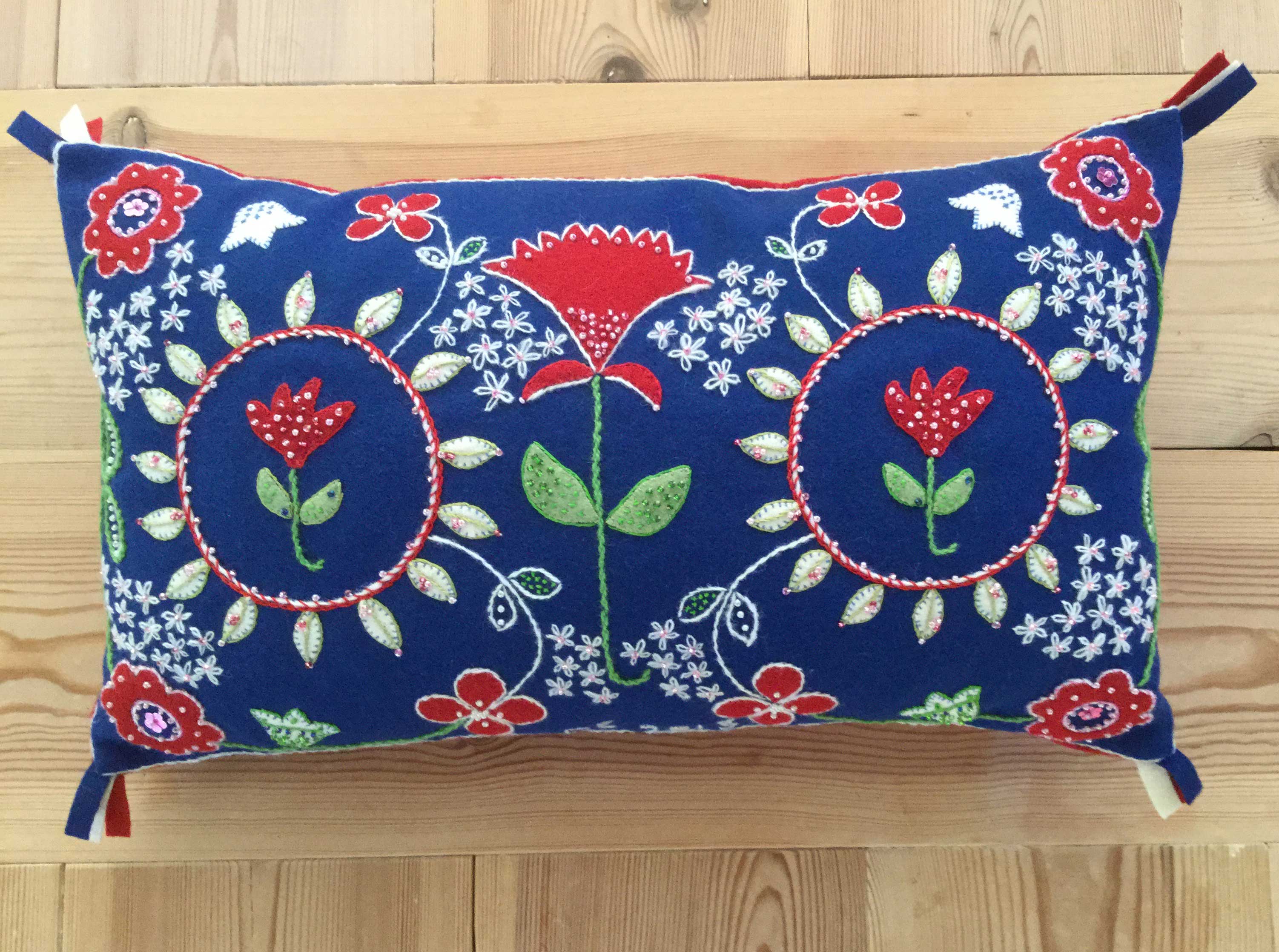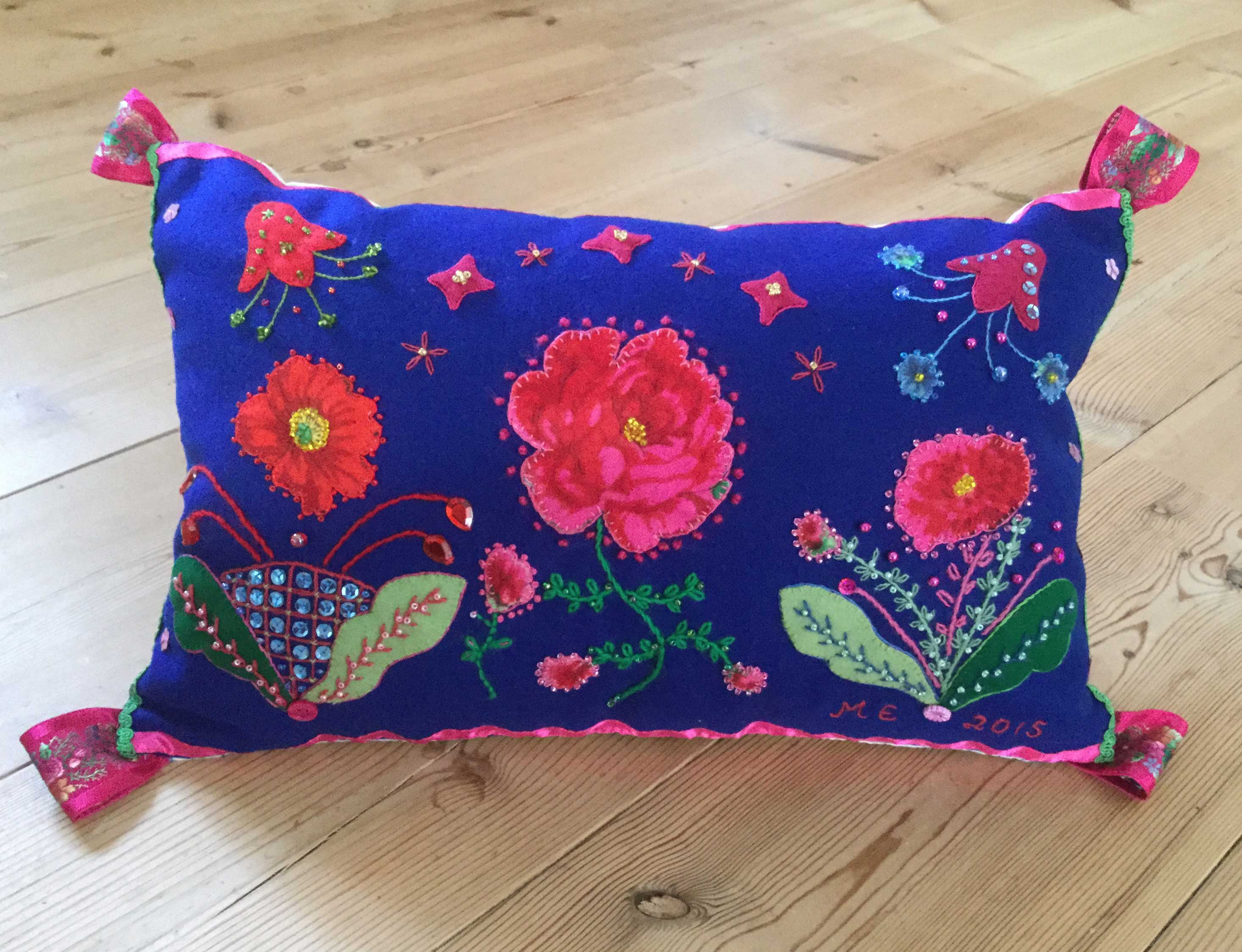 Tidigt tänkte Mia: Någon gång ska jag få tid att lära mig denna form av broderi och då ska mina kuddar inte förvaras i trälådor på vinden utan vara till glädje för mig , familj och vänner i vardagen.